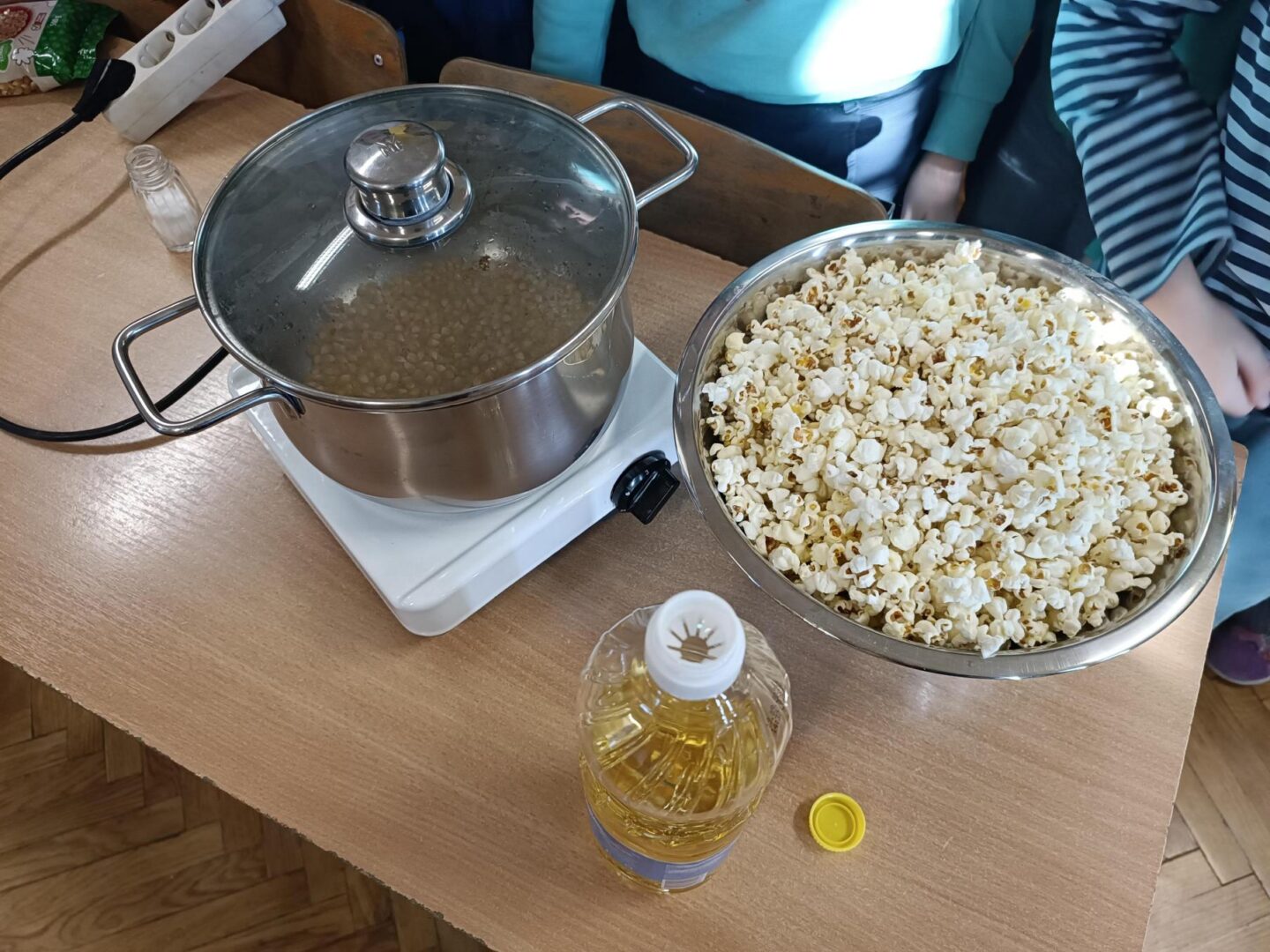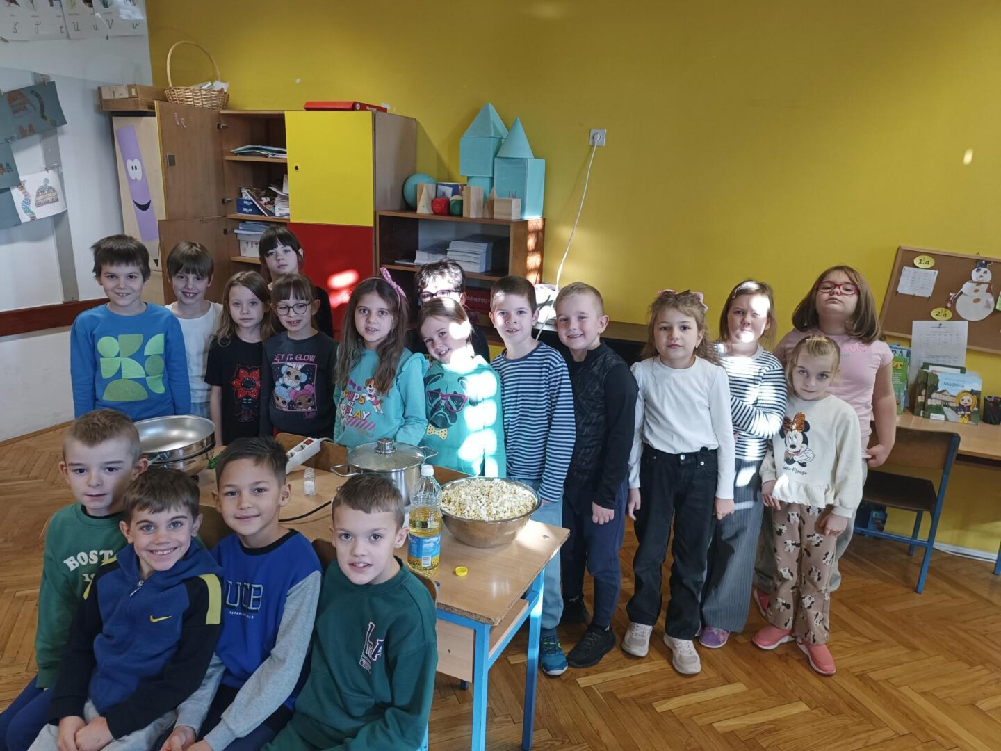 Jeste li se ikad pitali jesu li kokice zdrava grickalica?! Kokice su bogate vlaknima, a ako se pripremaju bez puno masnoće, pripadaju zdravijim grickalicama. Što je najvažnije, ne debljaju ako se pripreme na dobar stari način. Taj način pripreme isprobali su učenici 1.a razreda. U loncu s malom količinom ulja i malo soli, dodali smo kukuruz kokičar i dobro ga zagrijali. Doživljaj je bio kad je počelo njegovo pucketanje jer je većini djece bilo prvi put pripremati kokice na taj način. Cijelu smo priču upotpunili gledanjem kratkog crtanog filma, baš kao u kinu i time obilježili Svjetski dan kokica, 19.1.